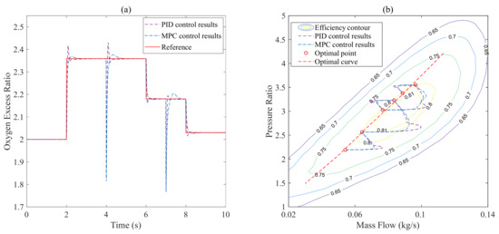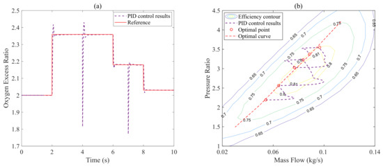In Figure 5a, the load current changes step at 4 s and 7 s, and in Figure 5b, the optimal oxygen excess ratio changes step at 2 s, 6 s and 8 s. Therefore, at 2 s, 4 s, 6 s, 7 s and 8 s in Figure 6a, the actual oxygen excess ratio changes, and the oxygen excess ratio can be adjusted to the target value under the regulation of the PID control algorithm, but there is a certain amount of overshoot. In the overshoot condition, the compressor will deviate from the stable operating point under the fixed current request. In Figure 6b, the compressor mass flow and pressure ratio curve deviates from the set optimal working curve, and at the same time, due to the overshoot of the oxygen excess ratio during the control process, the compressor efficiency will decrease.