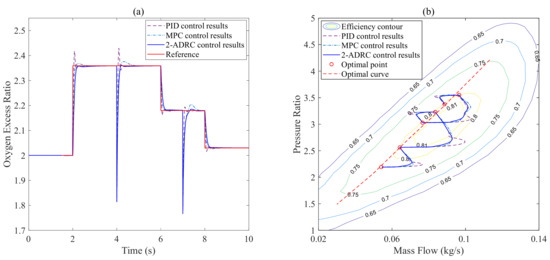 In Figure 8a, when the load current request and the reference oxygen excess ratio change, the PEMFC air supply subsystem can quickly adjust the oxygen excess ratio to reach the optimal reference value. Compared with the PID algorithm and MPC algorithm, the 2-ADRC algorithm can quickly adjust the oxygen excess ratio to the optimal reference value without overshoot and achieve a better control effect of the oxygen excess ratio in the PEMFC air supply subsystem. In Figure 8b, when adjusting the oxygen excess ratio of the air supply subsystem, the compressor speed will be quickly adjusted to improve the air mass flow into the FCS. Therefore, the power consumption of the compressor will rise instantaneously, and the mass flow and pressure ratio curve of the compressor will also deviate from the set optimal working curve. Compared with the PID algorithm and MPC algorithm, the 2-ADRC algorithm can make the compressor work in the high-efficiency zone.