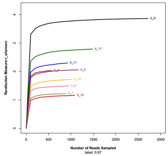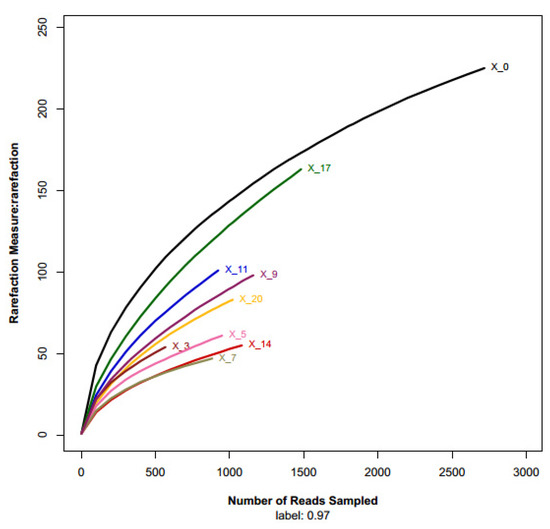 After sequencing, low-quality sequences were filtered, and high-quality sequences were clustered into operational taxonomic units (OTUs). All sequences were classified from phylum to genus at the 97% sequence similarity level according to silva (version 115 http://www.arb-silva.de accessed 20 July 2021) using the RDP Classifier (version 2.2 http://sourceforge.net/projects/rdp-classifier/ accessed 20 July 2021) of the Qiime platform. Sequences that could not be classified into any known group are labeled “unclassified”. Taxa in proportions <1% were grouped as “Others”. Rarefaction analysis, OTU cluster analysis, and principal component analysis (PCA) were performed using Mothur, as reported in our previously study [8].