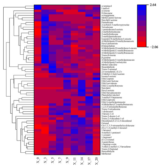 The content distribution of the VOCs in fresh Capsicum annuum L. Var. Dactylus M and different fermentation stages of Capsicum annuum L. Var. Dactylus M. The clustering was performed with OriginPro 2019. The colors correspond to normalized mean levels from low (red) to high (purple).