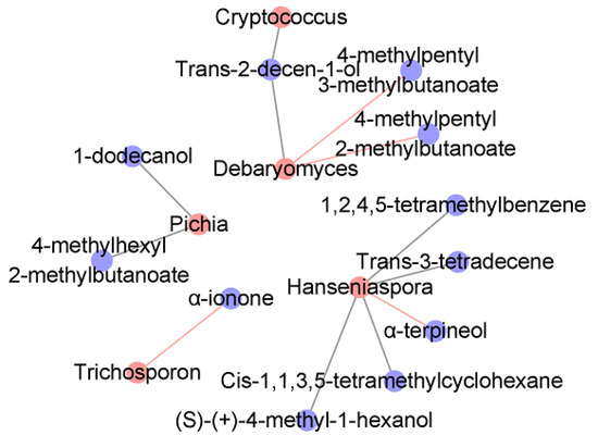 In the fermentation process of the peppers, five kinds of fungi were identified as the core functional fungi because of their high abundances throughout the whole fermentation process, high VIP values (VIP > 1.0), and the high absolute values of the linear correlation coefficient between the concentration profile of the volatile flavor compounds and the fungi (R > 0.7). The significant linear correlation coefficient (with a significance p < 0.05) between the selected microorganisms and the flavor compounds was calculated and is shown in Figure 6. Five kinds of fungi, Pichia, Hanseniaspora, Cryptococcus, Debarvomvces, and Trichosporon, were closely correlated with the concentrations of the flavor compounds. The abundance of Pichia was positively correlated with 4-methylhexyl 2-methylbutanoate and1-dodecanol. The abundance of Hanseniaspora was positively correlated with 1,2,4,5-tetramethylbenzene, trans-3-tetradecene, Cis-1,1,3,5-tetramethylcyclohexane, and (S)-(+)-4-methyl-1-hexanol (p < 0.05, R > 0.73) and negatively correlated with α-terpineol (p < 0.05, R < −0.83). The abundance of Cryptococcus was positively correlated with trans-2-decen-1-ol (p < 0.05, R > 0.78). The abundance of Debarvomvces was positively correlated with trans-2-decen-1-ol (p < 0.05, R > 0.82) and negatively correlated with 4-methylpentyl 3-methylbutanoate and 4-methylpentyl 2-methylbutanoate (p < 0.05, R < −0.77). The abundance of Trichosporon was negatively correlated with α-ionone (p < 0.05, R < −0.72).