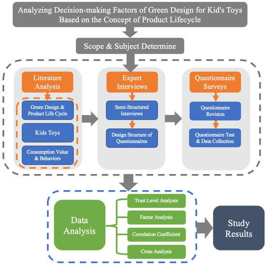 At the same time, tests were launched based on questionnaire surveys on consumers who had purchased or played with kid’s toys. Last, the IBM® SPSS® (V22.0) statistical software was adopted for analyzing and verifying the information, including reliability analysis, factor analysis, correlation coefficient analysis and cross analysis. As a result, the design factors and purchasing decision factors of green design for the product life cycle, consumption values and behavior of kid’s toys were obtained. In combination with the mentioned research results, the decision-making factors of green design for kid’s toys were generalized. Figure 2 illustrates the research structure of this study.