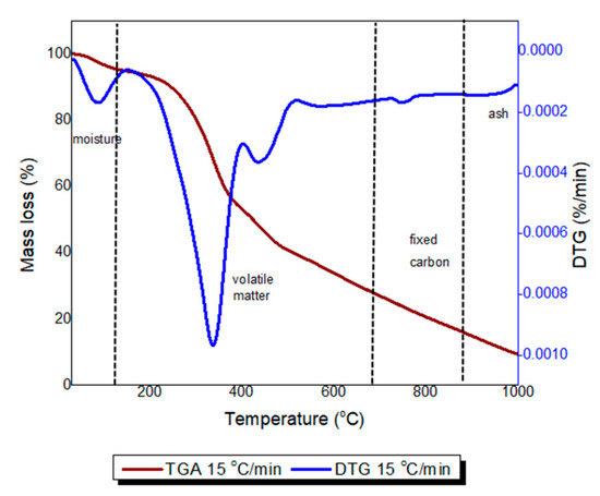 Different temperatures of the TGA process indicate different material losses. For instance, moisture (M) is released at 120 °C [13], below 150 °C [15,19], in the range of 100–150 °C [16], at 110 °C [17], and below 220 °C [14]. The difference in the temperature of moisture removal depends on the atmosphere, or the carrier gas used [21]. Volatile matter (VM) evaporation occurred at a temperature range from moisture removal, at up to 550 °C [13], up to 580 °C [15], 485–600 °C [25], up to 490 °C and 628 °C under N2 and air atmosphere, respectively [21]. The next peak on the DTG curve above 500 °C denotes fixed carbon (FC) content, and the final composition of the feedstock indicates ash content in the feedstock.