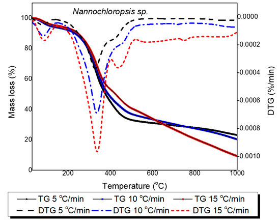 In this study, the LEA was from subcritical water extraction (SWE) of algal oil. To the best of our knowledge, no studies are available in the literature reporting the thermal behavior of LEA from the subcritical water extraction (SWE) of algal oil. The TGA process of LEA was conducted using N2 at different heating rates (5, 10, and 15 °C/min) from room temperature to 1000 °C, and the thermal behavior of the samples during TGA was studied.