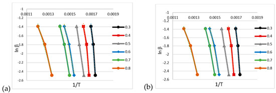 The activation energy for the specified value of conversion, α, of the thermal decomposition reaction is obtained from the slope of the curves, versus (−1.052E/R) and lnβ versus 1/T (−E/R) for the KAS and FWO models, respectively [21,30,31]. Repeating the activation energy determination for the whole range of α from 0 to 1 will result in activation energy of progressing values of α for both models.
