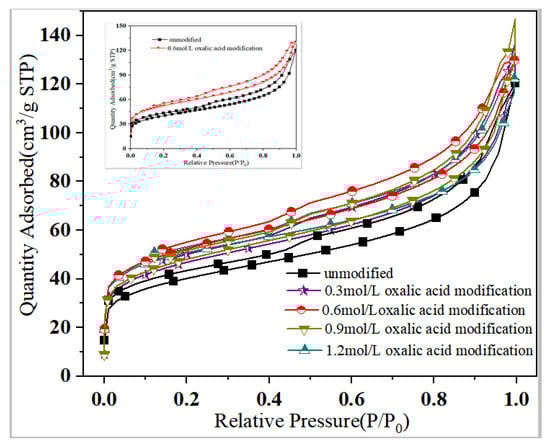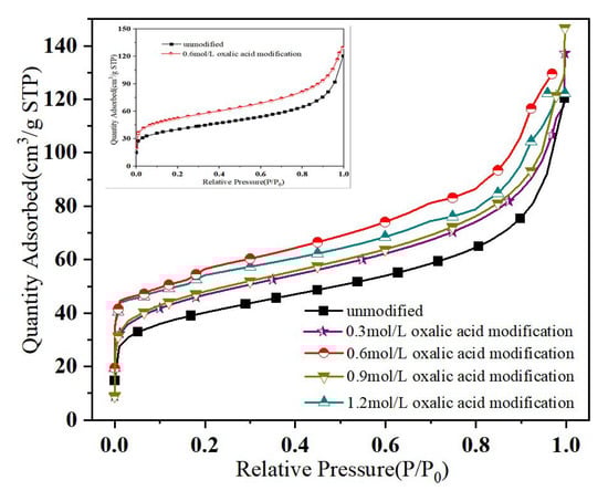 As shown in Figure 1, all activated carbon samples show the pattern of Type II adsorption isotherm, also known as the inverse S adsorption isotherm. This illustrates that the adsorption in the samples affiliates to multi-molecular layer adsorption on the surface of a non-porous solid. When P/P0 < 0.03, the adsorption capacity of activated carbon for nitrogen increases rapidly. When P/P0 ranges between 0.03 and 0.8, the first half of the isotherm climbs slowly as the mesoporous adsorption plays a dominant role. Followed by an upward convex shape, the adsorption of the first layer is roughly completed, indicating the saturated adsorption capacity of the monolayer. When P/P0 > 0.8, the second layer of adsorption begins growing, and the isotherm exhibits an upward convex to form a steep slope. Under an increasing relative pressure, the adsorption capacity grows dramatically due to the capillary condensation of the adsorbate, while the adsorption isotherm in the second half tilts upwards rapidly. When P/P0 approaches the saturated vapor pressure, the adsorption saturation is not yet reached. As shown in Figure 2, the adsorption capacity of activated carbon for nitrogen follows the order of 0.0006 mol/cm3 oxalic acid modification > 0.0009 mol/cm3 oxalic acid modification > 0.0012 mol/cm3 oxalic acid modification > 0.0003 mol/cm3 oxalic acid modification > unmodified, indicating that the increase in mesopores enhances the adsorption capacity of activated carbon. With the increase in pores after modification, the order of specific surface area is consistent with the adsorption capacity. The larger the specific surface area, the greater the adsorption capacity.