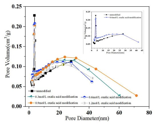 Pore size distributions of oxalic acid-modified activated carbons with different concentrations using the BJH method.