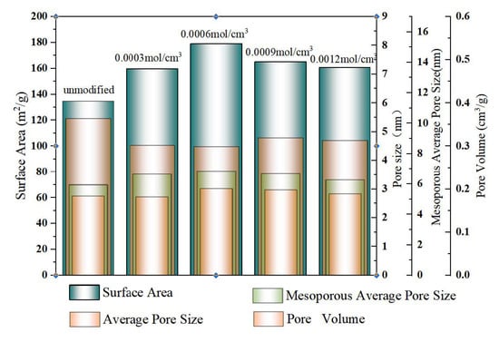 The specific surface area and cumulative pore volume of activated carbon modified by acid with different concentrations are shown in Figure 4. The specific surface area of untreated activated carbon is 134 m2/g, and the pore volume and pore size are 0.18406 cm3/g and 5.46 nm, respectively. As oxalic acid concentration increases, the specific surface area and pore volume grow and the pore size shrinks. When the oxalic acid concentration is at 0.0006 mol/cm3, the specific surface area reaches the maximum of 179.06 m2/g, 25.7% higher than that of unmodified honeycomb activated carbon. The pore volume increases by 9.09% to the maximum value of 0.20088 cm3/g. The average pore size of mesopores increases by 15.56% to 6.86 nm. Since the impurities, ashes, and excessive binders on the surface of activated carbon cannot be eliminated at low impregnation concentrations, the surface structure of activated carbon may have been destroyed irreversibly with the extremely high concentration of the impregnation solution, leading to the collapse of internal pores and the decrease in specific surface area, pore volume, and average mesoporous pore size.