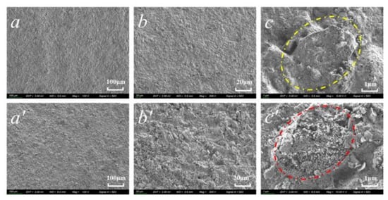 SEM comparison of unmodified activated carbon and 0.0006 mol/cm3 oxalic acid-modified activated carbon. (a–c) shows SEM images of the unmodified activated carbon at 100 μm, 20 μm, and 1 μm, while images (a′), (b′), and (c′) correspond to 0.0006 mol/cm3 oxalic acid modification at magnifications of 100 μm, 20 μm, and 1 μm SEM images of the activated carbon.