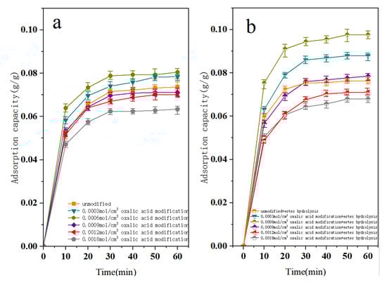 Given the same temperature and humidity (30 °C, 80%), Figure 7 illustrates the static adsorption curves of activated carbon under different modification methods. In the first 10 min, the adsorption rate of activated carbon is obviously faster and the weight rises. Then, 30 min later, the adsorption capacity is close to saturation with a slowed rising speed. As shown in Figure 7a, the cumulative adsorption capacity of unmodified activated carbon reaches 0.07 g/g. The 0.0006 mol/cm3 oxalic acid-modified activated carbon exhibits a higher adsorption rate and a larger cumulative adsorption capacity of 0.081 g/g than that of unmodified and other modified activated carbon with varied acid concentrations. When comparing with the unmodified activated carbon, the adsorption capacity increased by 15.7%. The adsorption capacity of 0.0003 mol/cm3 oxalic acid-modified activated carbon is slightly higher than that of unmodified activated carbon, while the concentrations of 0.0009 mol/cm3, 0.0012 mol/cm3, and 0.0018 mol/cm3 oxalic acid-modified activated carbon were lower than that of the unmodified activated carbon in turn. The static adsorption results are similar to that of the specific surface area changes of activated carbon, which further illustrates an increasing specific surface area due to oxalic acid modification and the pore volume of honeycomb activated carbon. It is a useful means to improve the adsorption capacity of activated carbon [].