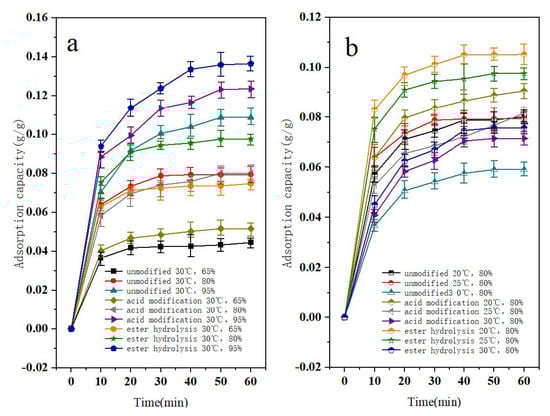 The moisture absorption contrast experiments analyzed the water vapor adsorption properties of activated carbon that was unmodified, 0.0006 mol/cm3 oxalic acid modified, 0.0006 mol/cm3 oxalic acid modified, and ester hydrolyzed under different humidity or temperature conditions. As shown in Figure 8a, at the same temperature, the adsorption rate of activated carbon improves as the relative humidity increases in the space and the adsorption level grows higher. For activated carbon that is 0.0006 mol/cm3 oxalic acid modified and ester hydrolyzed, the cumulative adsorption capacity increases by 0.025 g/g for every 15% increase in relative humidity at a temperature of 30 °C. The max adsorption capacity per hour can reach 0.14 g/g when the relative humidity reaches 95%.