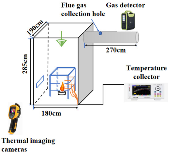 The experimental system is shown in Figure 1. The experimental platform comprises a confined space, fine water mist fire extinguishing system, combustion plate, K-type thermocouple, temperature collector, gas analyzer, glass door, and video camera. The size of the confined space is 1.8 m × 1.8 m × 3 m. The nozzle is positioned 2.3 m above the platform, directly over it. The laboratory has an iron frame that will be used to place thermocouples. An iron plate is placed in the centre of an iron frame to retain combustibles. Record the firefighting process with video and thermal imaging cameras (FLUKE–Ti400).