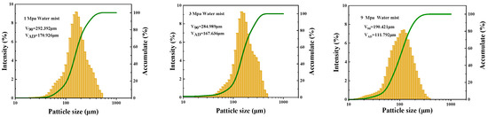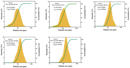 A total of 5 nozzles are selected in this paper: open and closed umbrella centrifugal nozzle, with a diameter of 1 mm. The experimental equipment for measuring water droplet particle size was the Winner9 industrial spray laser particle size analyzer. The principle of the instrument is to measure the scattering spectrum of the particle group and then analyze the particle size distribution law. The particle size distribution of the water droplets of the 7 L/min nozzles under the pressure of 1, 3, and 9 MPa is shown in Figure 2. The particle size distribution of water droplets at 5 nozzles under 9 MPa pressure is shown in Figure 3.