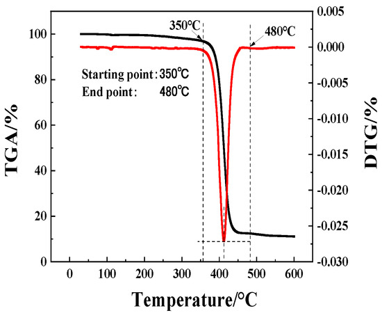The thermogravimetric analysis of the thermal insulation material is carried out as shown in Figure 4 and Table 1. The thermal decomposition of the thermal insulation material has only one main stage, which starts at 100 °C; the thermal mass loss is about 5%, and a small mass loss peak occurs on the corresponding DTG curve. The heat loss at this stage is mainly because of the gradual volatilization of the residual moisture and blowing agent in the material as the temperature increases, but the molecular chain in the polystyrene foam does not break. The reaction temperature range of the second stage is about 350–480 °C. Thermal mass loss accounts for about 90% of total mass loss. A larger mass loss peak also appears on the corresponding DTG due to oxygen in the atmosphere [32]. At this time, the molecular chains with less energy required in the rigid polystyrene foam are broken to form free radicals and release heat. The polystyrene at this temperature undergoes a combustion reaction, releasing a large amount of gas, and there are a lot of toxic and harmful components in the gas [33,34].