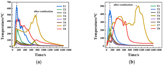 Temperature curve of thermal insulation material under natural combustion state: (a) where the materials are placed horizontally, (b) where the materials are placed vertically.