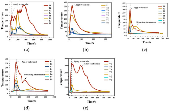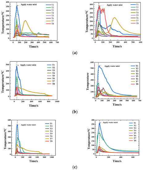 Figure 7 is a graph of temperature changes during the water mist fire extinguishing process under different pressure conditions. Figure 7a shows that when the water mist is applied for a while, the flame extinguishing temperature decreases, but two minutes after the flame is extinguished, thermocouple 1 shows a growth curve, and the flame appears to reignite. This reignition phenomenon shows that although the fine water mist of 1 MPa can extinguish the flame, it cannot prevent the problem of reignition of the thermal insulation material.