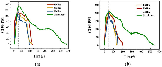 Change curve of CO concentration under different pressures: (a) materials are placed horizontally, (b) materials are placed vertically.