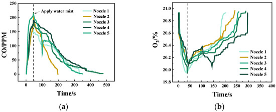 Figure 11 shows the CO concentration map of different nozzles, which reveals that the CO concentration produced by nozzle 2 is lower than that of the other nozzles. After nozzle 5 is turned on, the CO concentration drops rapidly, and the decline is greater than that of nozzle 2. However, after the subsequent stop of water mist spraying, the phenomenon of reignition occurred. CO concentration rises again due to the large particle size produced by nozzle 5, which greatly inhibits the flame in the early stage of the fire. However, because the thermal insulation material is covered with a protective layer, the fine water mist does not enter the inside of the thermal insulation material during the fire extinguishing process. When the flame on the surface of the thermal insulation material is extinguished, the water mist-generating device is turned off. Since the residual temperature remains inside the thermal insulation material, it will re-burn after reaching the ignition point.