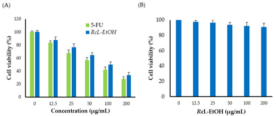 RcL-EtOH-mediated cytotoxicity in A549 cells. (A) Cell viability percentage of A549 cells post-treatment with either 5-fluorouracil (5-FU), and RcL-EtOH (0–200 µg/mL) for 48 h. (B) Cell viability percentage of J774A.1 cells post-treatment with RcL-EtOH. Data represents mean ± SD (n = 3).
