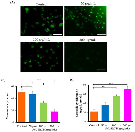 (A) Photomicrographs depicting the dissipation of ΔΨm within A549 cells post-treatment with varying concentrations (50, 100 and 200 µg/mL) of RcL-EtOH. Scale bar = 100 µm. (B) Quantification of mean fluorescence intensity. (C) Effect of RcL-EtOH on cytosolic cytochrome c. * p < 0.01, ** p < 0.01, *** p < 0.001 vs. control.