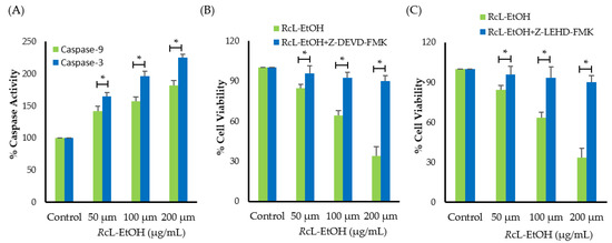 (A) Impact of RcL-EtOH on caspase-3 and -9 activities. Cell viability of A549 cells pre-treated with inhibitors of (B) caspase-3 and (C) caspase-9. * p < 0.05.