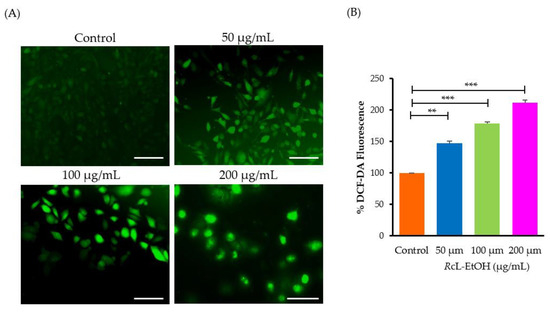 ROS levels within A549 cells was assessed following treatment with RcL-EtOH using the fluorescent marker 2,7-dichlorodihydrofluorescein diacetate (DCFH-DA), as previously described [18]. In brief, A549 cells were plated onto a 96-well plate, at a density of 5 × 103 cells per well, and were allowed to incubate overnight for adherence under standard culture conditions. Subsequently, A549 cells were treated with 50, 100 and 200 µg/mL of RcL-EtOH and were further incubated for 48 h. The treated cells were then trypsinized, rinsed and incubated with DCFH-DA (10 µM) in the dark at room temperature for 30 min. The DCF-DA-mediated fluorescence intensity was visualized as green fluorescent in the photomicrographs of RcL-EtOH-treated A549 cells using the FLoid imaging station (Thermo-Scientific, Waltham, MA, USA).