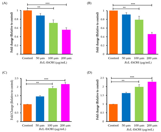 Deregulation of the cell cycle and apoptosis mechanisms in normal cells is a key determinant for the development and/or progression of cancer [28]. Consequently, in order to gain more insight onto the underlying mechanism of the anticancer activity of RcL-EtOH against A549 cells, the mRNA expression levels of cell cycle- and apoptosis-regulating genes were assessed using a qRT-PCR analysis. As shown in Figure 6, the mRNA expression levels of anti-apoptotic markers; namely, Bcl-2 and BClXL, were remarkably downregulated in RcL-EtOH-treated cells. The mRNA expression of Bcl-2 was decreased to 0.88 ± 0.03, 0.71 ± 0.05 and 0.55 ± 0.03-fold (Figure 6A), whereas that of BClXL was observed to be reduced by 0.90 ± 0.03, 0.78 ± 0.07 and 0.45 ± 0.02-fold, compared to untreated cells (Figure 6B). By contrary, treatment with RcL-EtOH efficiently triggered a remarkable increase in the expression levels of pro-apoptotic markers; namely, Bax and Bad (Figure 6C,D). Of note, treatment with 200 μg/mL of RcL-EtOH resulted in a more than two-fold increase (2.16 ± 0.09 and 2.31 ± 0.08) in the expression of both tested pro-apoptotic genes (Bax and Bad), respectively. These findings suggest that RcL-EtOH-mediated apoptosis might be elicited via upregulating the expression of pro-apoptotic proteins, while down regulating the expression of anti-apoptotic proteins in A549 cells.