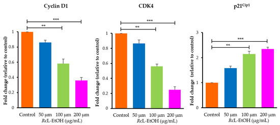 Changes within the mRNA expression of genes involved in cell cycle progression (cyclin D1, CDK4 and p21cip1) after exposure to RcL-EtOH. ** p < 0.01 and *** p < 0.001 vs. control.
