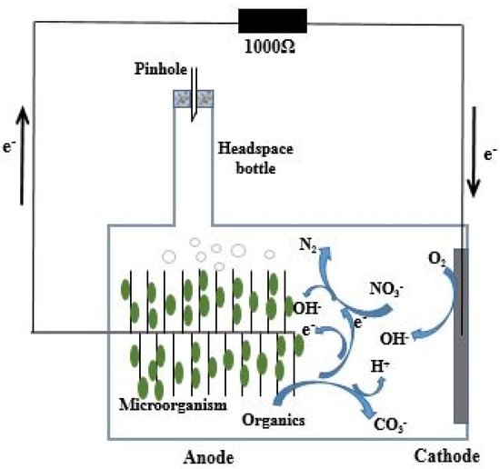 Microbial fuel cell (MFC) is a new biological technology that is capable of synchronously treating wastewater and recovering chemical energy contained in the wastewater [44,45]. It has been considered as the most sustainable wastewater treatment technology in which treating wastewater does not need energy input but gain energy output. In recent years, MFC has been thoroughly investigated to treat various wastewaters by removing not only the chemical oxygen demand (COD), but also other pollutants like nitrogen, sulfur and phosphate [46,47,48]. For nitrogen removal, MFC has shown several advantages over the traditional biological methods such as low cost resulting from the reduction in the requirement of carbon source [49] and sludge production [50], as well as good capability of treating a wide region of nitrate concentrations [51].