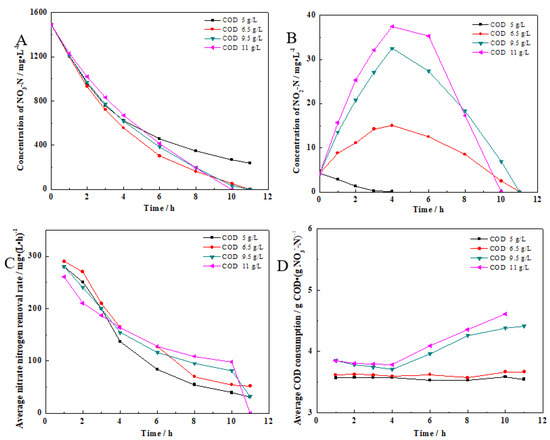 Changes of nitrate nitrogen concentration (A), nitrite nitrogen concentration (B), average nitrate nitrogen removal rate (C) and average COD consumption and COD (D) under different COD concentrations.