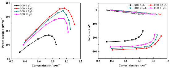 Power density curve (Left) and polarization curve ((Right): close circuit symbol, cathode potential; open circuit symbol, anode potential) under different COD concentrations.