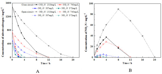 Changes of total nitrogen concentration (A) and nitrite nitrogen concentration (B) under open-circuit/closed-circuit.