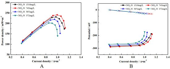 Power density curve (A) and polarization curve ((B): close circuit symbol, cathode potential; open circuit symbol, anode potential) under different initial nitrate nitrogen concentrations.