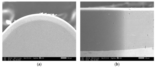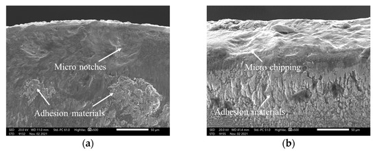 Figure 13 shows an enlarged view of the adhesion material on the rake face and flank face. It is revealed that the tool wear mechanism was mainly adhesion wear at the rake face and micro chipping at the tool chamfer. Under the action of the cutting force, the workpiece material and fragment chips were adhered and embedded on the tool surface, thus forming a bulge on the tool surface. These adhesion materials underwent serious friction and shear action with the continuous cutting process. Hence, some adhesion materials were fractured and fell off from tool surface. Simultaneously, this caused some tool material to spall and drop off from the surface, and then micro notches were formed on the rake face, as shown in Figure 13a. This adhesion wear mechanism would continue periodically throughout the cutting process. A negative rake angle caused very serious stress distribution in the local zone on the tool chamfer. At the same time, the adhesion wear could induce some micro cracks or notches on the too chamfer, which could further develop into micro chipping under a large stress distribution.