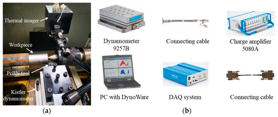 Dry turning experiments were conducted on a CNC turning machine tool (CAK6150, Shenyang Machine Tool Co., Ltd., Shenyang, China) as shown in Figure 2a. This machine tool is widely used to manufacture rotary parts in various applications. The maximum spindle rotating speed was 2000 rpm. The workpiece material was gray cast iron HT200, which is widely used for the brake disc and engine cylinder in the automotive industry [20,30]. The material properties of the workpiece are listed in Table 1. The workpiece samples were cut into small pieces with dimensions of Ø 50 × 250 mm, and then clamped in a three-jaw chuck machine tool. In the turning experiments, the cutting temperature was measured using a thermal imager (TIM 200, Micro Epsilon, Germany), with a temperature measurement range of −20–900 °C. The cutting force was recorded using a dynamometer (9257B, Kistler, Winterthur, Switzerland), which is widely used in various applications for cutting force measurement [31]. The cutting force measurement system was composed of a dynamometer, connecting cable, charge amplifier (5080A, Kistler, Winterthur, Switzerland), DAQ system, and PC, as shown in Figure 2b. The sampling frequency used in cutting force measurement was 20 kHz to obtain the complete cutting force signal without distortion.