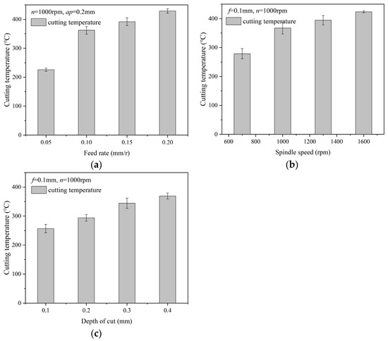 The cutting temperature dramatically affects the cutting process and the machining quality. Figure 4 shows the effect of machining parameters on the measured cutting temperature. The results show that the cutting temperature increased from 226 °C to 429 °C with the feed rate increasing from 0.05 mm/r to 0.2 mm/r. Its increasing rate was rapid at first but decreased for a feed rate larger than 0.1 mm/r. The cutting temperature increased from 278 °C to 423 °C with the cutting speed increasing from 100 m/min to 251 m/min. The initial increasing rate slowed after the cutting speed exceeded 157 m/min. This was probably due to the the heat dissipation area being similar under the same depth of cut when the cutting temperature was relatively higher with more extensive machining parameters, while the temperature difference with the surrounding environment became larger. Hence, the larger temperature difference caused more heat dissipation and resulted in a relatively low temperature increase. The cutting temperature almost linearly increased from 257 °C to 369 °C with an increase in the depth of cut, while the heat dissipation area also increasing with the depth of cut.