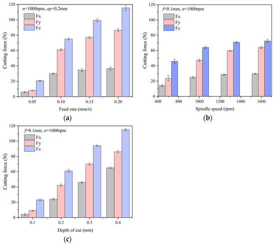 Effect of machining parameters on cutting force: (a) effect of feed rate on cutting force; (b) effect of cutting speed on cutting force; (c) effect of depth of cut on cutting force.