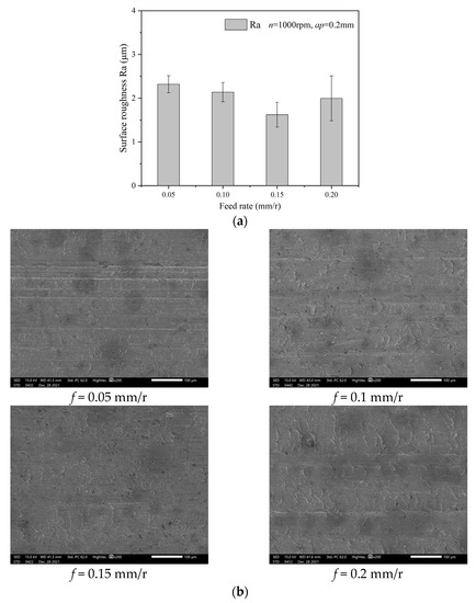 Figure 7 shows the surface roughness Ra and surface morphology under different feed rates. It was found that the surface roughness firstly decreased and then increased with an increase in feed rate. The built-up edge was formed on the tool rake face due to the adhesion materials. When the built-up edge along the tool nose arc was uneven, the actual undeformed chip thickness along the tool nose arc was also uneven. Then, the uneven undeformed chip thickness led to transverse micro tears perpendicular to the cutting direction [34]. These micro tears on the surface morphology confirmed the formation of built-up edge in the cutting process.