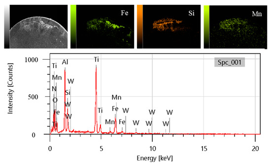 To confirm the composition of the adhesion material, an EDS analysis was performed, and the results are shown in Figure 12. It was found that, in addition to the elements of the PCBN tool, the main elements of the adhesion material constituted Fe, Si, Mn, etc. These elements corresponded to the composition of gray cast iron, confirming that the adhesion material was the workpiece material. These adhesion materials on the tool surface could easily generate the built-up edge phenomenon in the cutting process.