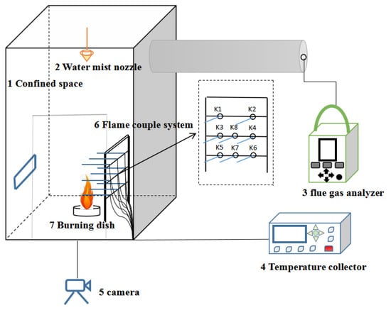 The experimental platform is composed of a confined space, water mist system, fire source, temperature measurement system, gas analyzer, and video camera, as shown in Figure 1. The experimental platform space was designed to be 1.8 m × 1.8 m × 3 m. The frame of the confined space is a steel structure. Its bottom is ceramic tile, and the other five sides are tempered glass. This ensures a particular thermal insulation effect, tightness, and safety. In front of the confined space is a 0.8 m × 2 m glass door, which is convenient for entering and leaving the burning dish for experiments. The upper part of the confined space is a smoke exhaust pipe extending outdoors, and a gas analyzer is placed at the tail of the smoke exhaust pipe to record the smoke concentration. The water mist nozzle is placed 2.4 m above the fire source. The bottom thermocouple shall be placed 10 cm above the fire source, and other thermocouples shall be placed every 30 cm upward.