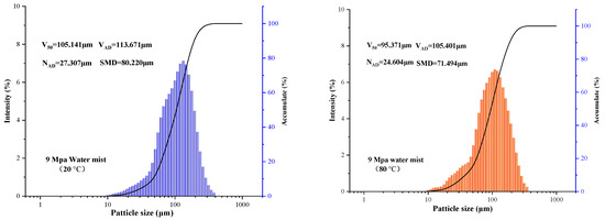 Particle size distribution of 20 °C and 80 °C water mist at 9 MPa.