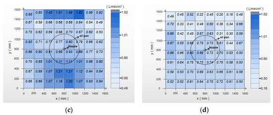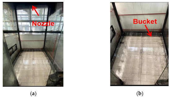 where Q (in L/min/m2) is the average bucket density in each bucket; V (in L) is the volume of water collected in the bucket; A0 (in m2) is the bucket collection area (A0 = 0.2 × 0.2 = 0.04 m2); t (in min) is the collection time.
