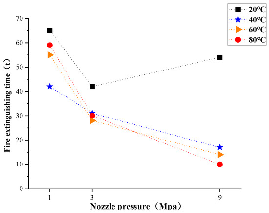 Due to the significant effect of the water mist temperature on the n-heptane fire, the middle 40 and 60 °C were also explored and then integrated. Figure 6 shows the extinguishing time of n-heptane fire at different temperatures. It can be seen that the water mist at 40 °C has the shortest extinguishing time under 1 MPa pressure. Under the pressure of 3 MPa, the extinguishing time of 60 °C water mist is the shortest, and the extinguishing time is 28 s. Under the pressure of 9 MPa, the extinguishing time of 80 °C water mist is the shortest, and the extinguishing time is 10 s. Considering the limitations of the low-pressure fire extinguishing system, the comprehensive analysis of the medium- and high-pressure results shows that the temperature with the short overall fire extinguishing time and the highest fire extinguishing efficiency is 80 °C.