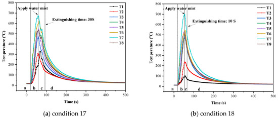 Each figure is divided into four stages: a, b, c, and d. Stage a is the ambient temperature before ignition; b is the temperature change of oil pool free combustion after ignition; c is the water mist fire extinguishing stage; d is the stage of free cooling to room temperature.