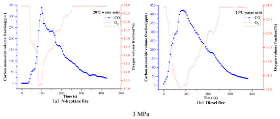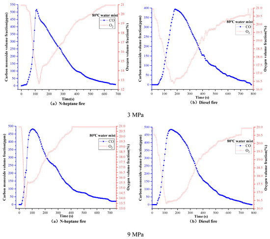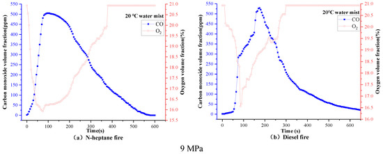 The longitudinal comparison (Figure 9) shows that the pressure acting on the n-heptane fire of 9 MPa consumes more oxygen than 3 MPa. As a result, less CO is produced, so the fire extinguishing effect is better under the pressure of 9 MPa. Although the CO produced by diesel fire under 3 MPa pressure is relatively small, the rate of oxygen reduction is not as apparent as 9 MPa, so the fire extinguishing effect of hot water mist under 3 MPa pressure on diesel fire is not obvious. Figure 10 shows that the change rate of O2 volume fraction of cold water mist on n-heptane and diesel fires at 3 MPa is faster than that at 9 MPa because the CO produced is also less. Therefore, the cold water mist under 3 MPa pressure can control the fire more, and the fire extinguishing time is also shorter [28].