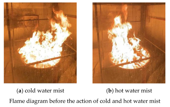 Since water splashes into the enclosed space outside the barrel and on the glass, an error of 5–8% can be allowed [19]. As seen in Figure 5c,d, hot water is more effective than cold water in the oil pan. In addition, temperature changes the movement mode of water mist molecules, improving hot water fire extinguishing.