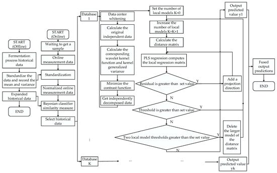 where is the true value, is the predicted value, and is the number of test data points. A flow chart of the KICA-JITL-LWPLS algorithm, based on the wavelet kernel function, is shown in Figure 1.