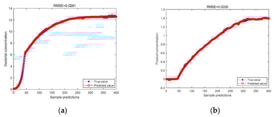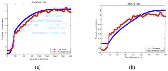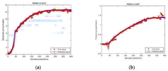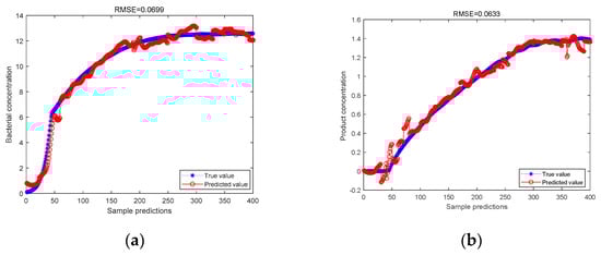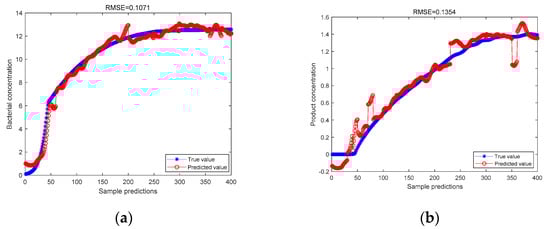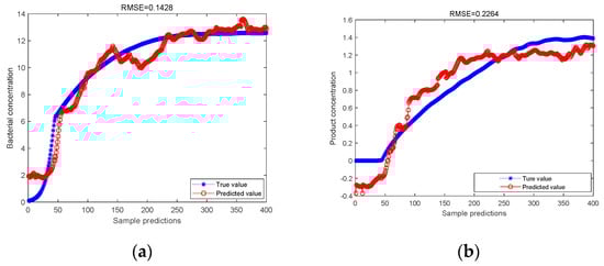 The above conditions were held constant, and the KICA algorithm, based on the wavelet kernel function, proposed in this paper was used to extract the independent elements of the test data and recombine them. The combined data were fed into the LWPLS sub-model to predict the concentrations of bacteria and products in the products, and the prediction results are shown in Figure 7.