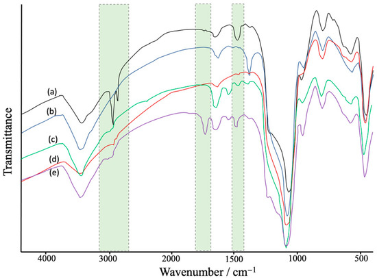 FTIR spectra: (a) Fe3O4-MSNs with CTAB, (b) CTAB free Fe3O4-MSNs, (c) Fe3O4-MSNs-NH2 (d) Fe3O4-MSNs-Br, and (e) Fe3O4-MSNs-PMETAC.