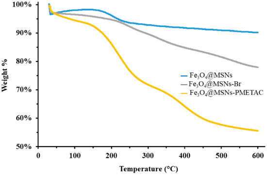 TGA analysis has been conducted to study the thermal stability and weight loss of the functionalized materials. CTAB-free Fe3O4-MSNs showed negligible weight loss with less than 5% at 600 °C, indicating the complete extraction of the template. The ATRP-initiator anchored on the Fe3O4-MSNs shows weight loss of around 20%; whereas the Fe3O4-MSNs-PMETAC shows weight loss of 45%, as demonstrated in Figure 3. The gradual weight increase confirms the successful synthesis of Fe3O4-MSNs-PMETAC.